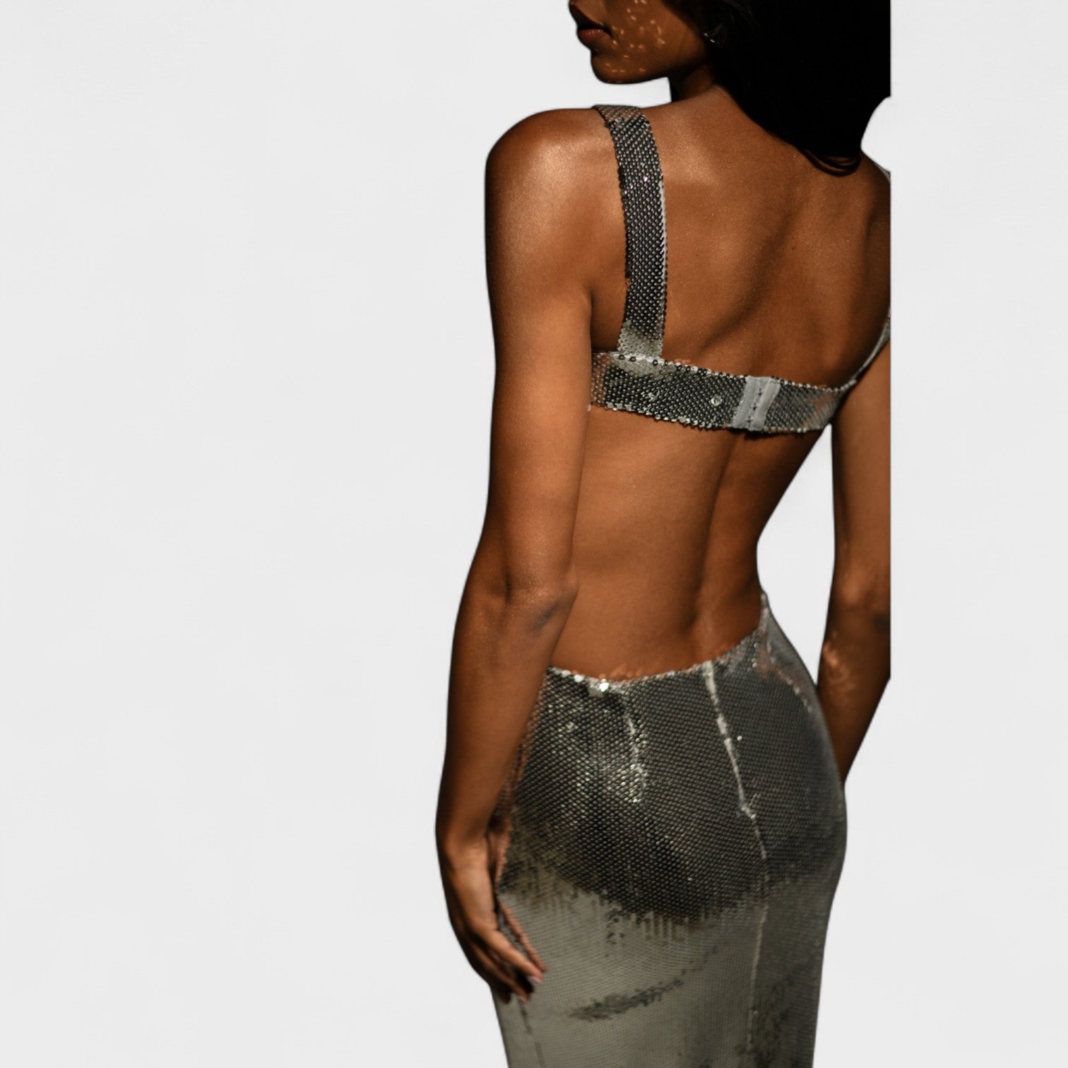 The Kiara dress captures attention at first glance. Its shimmery sequin fabric elegantly reflects the light, while the side slits create a sensual silhouette. Designed for women who dare to shine with every step.