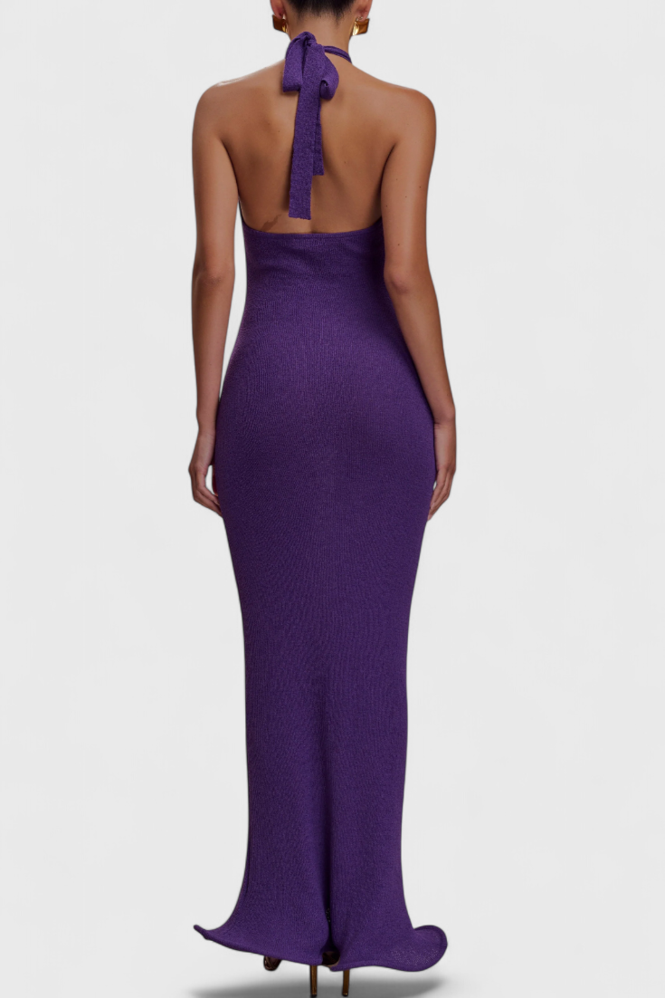 Sophisticated Minimalism with a Sculptural Touch. The Jianna dress embraces the silhouette with its elastic and soft knit, effortlessly shaping the body. Its halter neckline and open back reveal sensual elegance, while the wavy hem adds an unexpected and refined movement.