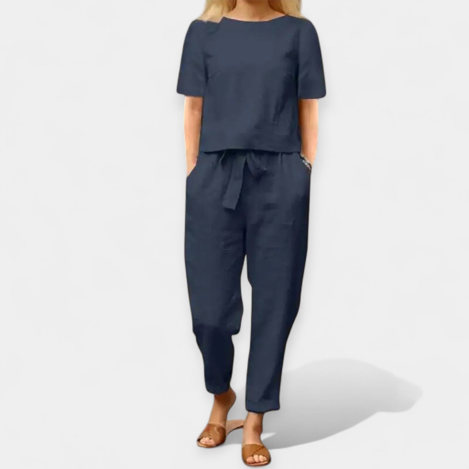 Värskenda oma suvegarderoobi selle elegantse ja mugava kahekordse komplektiga, mis on ideaalne nii kuumadeks päevadeks kui kahedaks õhtuteks. Komplekti kuuluvad kerge pluus ja laia lõikega nööriga püksid, mis pakuvad mugavust ja stiili igaks olukorraks.